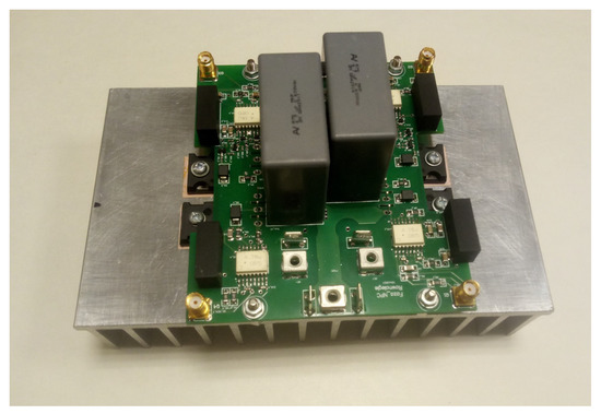 Figure 6 exhibits the laboratory setup of the inverter with anti-parallel reverse-blocking transistors in the horizontal branch. The circuit contains transistors placed on a heatsink, complete drivers with a secondary-side power supply, and supporting input capacitors. For the horizontal transistors, the driver proposed was applied (according to Figure 5). The transistors were controlled by an external control system based on Intel Cyclone V. The classic inverter and S3L were very similar and are made in the same way. The PCB has different power tracks in the horizontal branch and the classic drivers were used. The S3L (according to Figure 1) was based on a classic T-NPC inverter with the added LresC1(C2) resonant circuit and Dh1–Dh4 diodes. All three systems can convert the same power.