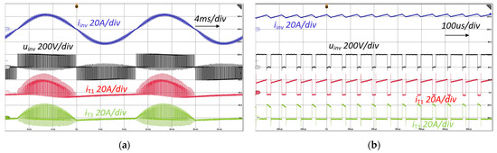 Steady state waveforms of the T-NPC inverter with two anti-parallel connected transistors in the horizontal branch: inverter current iinv (blue) 20 A/div, output voltage of the inverter uinv (black) 200 V/div, current of the transistor T1 iT1 (red) 20 A/div, current of the transistor T3 iT3 (green) 20 A/div; (a) 4 ms/div; (b) 100 us/div.