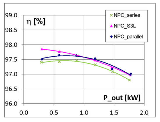 Figure 8 shows the efficiency results of the three systems presented earlier. The difference in efficiency of the classic T-NPC system compared with the proposed topologies ranges from 0.1% to 0.45%. The largest improvement of approximately 0.5% was visible for the S3L system in the low power range. The number and type of transistors used in the experiments were the same, while the turn-off losses of T1 and T4 have been reduced. For a light load, these losses are relatively large. As the load power increased, their share decreased and remained at 0.15–0.2%. When comparing the efficiency of the system in Figure 3 with a classic T-NPC inverter, the tendency is different than before. The number of semiconductors and conducted losses on them has now been reduced; therefore, the efficiency difference remains at a similar level over the entire load range. The results in this case will always depend to a small extent on the type of transistor used.
