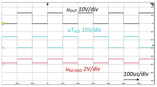 Waveforms of the proposed driver circuit: control signal of the transistor IGBT—uOUT (black) 10 V/div, control signal of the transistor T2—uT1CE (cyan) 10 V/div, DESAT signal—voltage across Rd-GND (red) 2 V/div; 100 us/div.