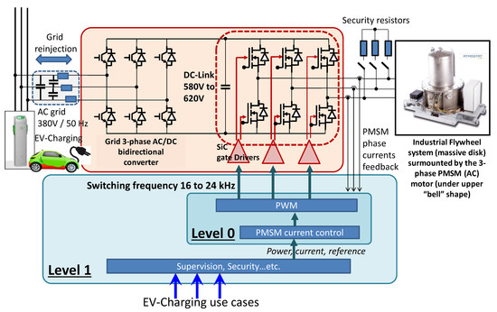 In the black square in Figure 1, there is the industrial flywheel system (massive disk) surmounted by the three-phase AC motor inserted under an upper “bell” metal shape. The flywheel system with its PMSM motor/generator and interface inverter is connected through the DC bus to a three-phase reversible converter ensuring current reinjection/supply with the 380 V/50 Hz grid network and is connected to a mixed DC–AC three-phase plant for EV-dynamic recharging. A two-level control strategy is used for the powertrain control. Level 1 deals with supervision and security issues, having as inputs the different use-case scenarios (named as macroscopic level). Level 0 (close-up control level) includes the control strategy in (d,q) the park reference frame for the three-phase PMSM currents and provides, through a real-Time prototyping system, the PWM signals to the gates of the three-phase DC–AC inverter transistors. A DC voltage security limit up to VDCmax = 700 V is added for the inverter protection.