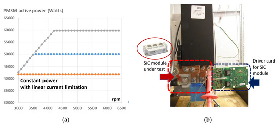 (a) PMSM power profile (W) with current limitation and field weakening. (b) Experimental set-up for HF switching test of the SiC 1200 V/300 A half-bridge with driver card.