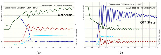 Figure 4a and Figure 4b, respectively, present the switching ON (a) and OFF (b) waveforms for 20 kHz frequency performed on the SiC MOSFETs devices. Oscillations amplitude phenomena, in particular for turn-off, have been attenuated using a 2 µF snubber capacitor connected in parallel to the MOSFETs half-bridge. The turn-on time is 300 ns and turn-off is 400 ns. Losses and efficiency for the DC–AC inverter will be given in Section 5.3. Numerical acquisitions have been performed using the oscilloscope Lecroy Wave runner HRO64i, the Vds measurement with sensor PM9100, Ids measurement using shunt LEM25 10 mΩ, and Vgate with Tektro P5050 recorder.