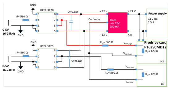 The driver card is composed of two input (0 to 5 V) PWM (pulse width modulation) stages corresponding to the upper and lower MOSFETs of the half-bridge. Each stage has an optocoupler HCPL-3120 for the isolation and voltage conditioning of the input voltage signal. Then the signal is boosted using the Traco© (Traco Power, San Jose, CA, USA) power supply to the input of the CREE Prodrive© (Banbury, UK) technologies card PT62SCMD12. The driver interface synopsis for one SiC inverter leg is given in Figure 5.