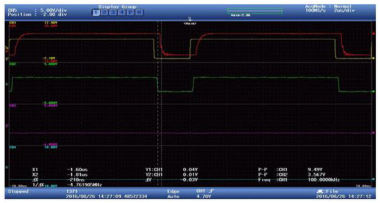 First, to be operated, the OCP (over current protection) mode of the driver card should be deactivated, then the driver card is supplied in 24VDC and the waveforms are acquired on the digital Yokogawa© (Tokyo, Japan) high speed scope recorder. The yellow waveform in Figure 6 represents the control signal injected in the HCPL-3120 optocouplers; the green curve represents the input voltage of the LS (low side) driver card and is between 1.5 V and −2 V. The purple curve is the HS (high side) part of the driver (2 V). Finally, the red waveform highlights the MOSFET voltage of the LS part of SiC module; it should be noted that we obtain +20 V for the ON state and −6 V for the OFF state. We should, however, notice that there appears to be a phase shift between the input of the driver card and the output gate control signal of LS MOSFET. The measured delay is Toff_fall = 250 ns; the manufacturer’s data of the driver card estimates the Toff_fall between 250 and 300 ns, hence, there is a good concordance. We also measured the Toff_rise = 610 ns. The manufacturer’s data gives a Toff_rise between 400 and 500 ns. We have hence validated the switching operating of a SiC half-bridge and have realized the complete interface card design for the three legs.