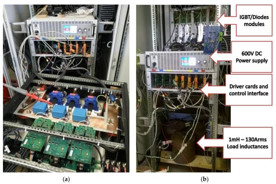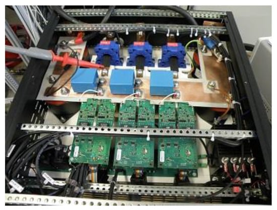 Figure 8 illustrates the realized DC–AC SiC inverter prototype (with current LEM© (Meyrin, Swizterland) sensors and driver cards Prodrive®) designed and built at the SATIE laboratory.