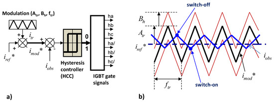 The principle of the method consists of superimposing to the reference current (iref*) a modulated triangular signal (itr) with an appropriate amplitude Atr and frequency ftr (Figure 10b). As a consequence, a modulated reference current (imod*) is generated, which constitutes the new reference for the current control loop, as given by Equation (2).