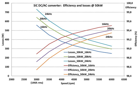 Figure 3 shows a comparison between the module efficiency between classical IGBT silicon technology from SEMIKRON© (Nuremberg, Germany) and silicon carbide MOSFETs from CREE® (Wolfspeed© Group, Durham, NC, USA) for the same component caliber and PMSM power values. Efficiencies have been calculated analytically using the manufacturer’s datasheets of the semiconductors. A gain of 5% is obtained for the same power constraint (at 60 kW) using the silicon carbide technology.