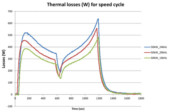Experimental thermal losses for the 50 kW speed up and down profile, and for different switching frequencies.