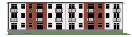 Comparative analyses of the demand for energy for heating purposes and preparation of hot utility water were carried out for the project of a multi-family residential building with an area of 1051 , in which 18 apartments are included. Detailed assumptions regarding solutions for the construction of building partitions and central heating installations are included in publication [22]. According to the design concept, it is a rectangular, 3-story, 2-staircase building with an unheated underground garage. In accordance with the design assumptions, the following were designed: external walls made of lime-sand blocks and thermally insulated with mineral wool boards; flat roofs made of reinforced concrete slabs and thermally insulated with extruded polystyrene, reinforced concrete interfloor ceilings; windows made of aluminum profiles, with a two-chamber glazing unit; external aluminum doors. The facade of the building is shown in Figure 1.