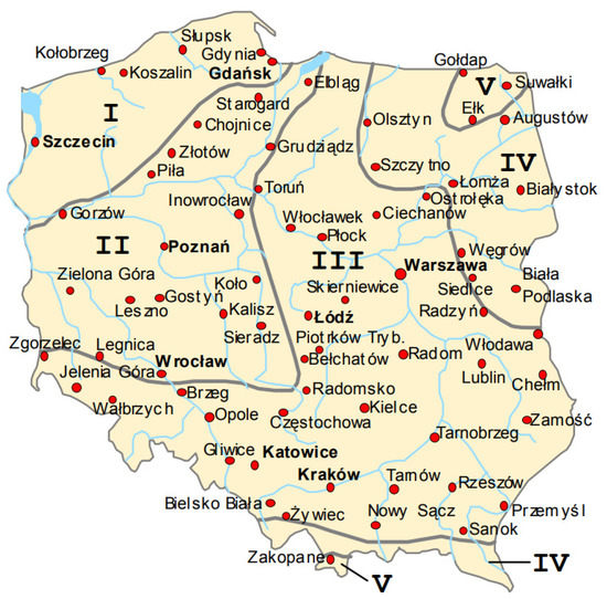 This article presents comparative analyses of the demand for usable energy for heating and ventilation in various locations in Poland. Energy calculations were made based on the CERTO 2015 simulation program, enabling the energy modeling of buildings for the respective calculation zones and rooms. The study incorporates the monthly method, which is used in Poland to determine the energy characteristics in accordance with [21,23]. Depending on the latitude and longitude, Europe has different types of climates. Poland is dominated by a temperate climate, but its three main subtypes can be distinguished: a warm climate, a mild climate, and a cold climate. Due to the division of the territory of Poland into five climate zones according to [24] and the different values of external temperatures and insolation for individual meteorological stations located in the country, the balance of demand for usable energy for heating and ventilation purposes was prepared for identical multi-family residential buildings located in 59 places in Poland, coinciding with the locations of meteorological stations. The territory of Poland, according to [24], is divided into five climate zones, in which the design external temperature, depending on the zone, ranges from −16 °C to −24 °C. The division of the climate zones is shown in Figure 2. The values of the design external temperature for the individual climate zones and average annual external temperatures are presented in Table 2.