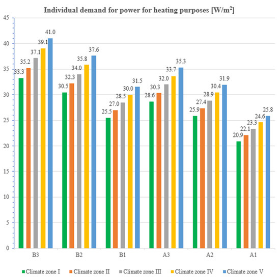 The analysis of the calculated indicators of the unit power demand for the heating purposes of buildings shows that the buildings designed in class A1, with mechanical supply and exhaust ventilation with heat recovery and partitions, corresponding to buildings with passive energy characteristics, have a lower demand for heat power for heating purposes. Due to the power of the heat sources, it was worth analyzing whether it is more advantageous economically to design I building in energy class A3 or B1. The analysis of the data shows that in the case of buildings located in climate zones IV and V, designing building partitions with higher thermal resistance than buildings located in climate zones I and II should be considered. The unit power demand for the heating purposes of buildings designed in energy classes B3, B2, B1, A3, A2, and A1 in Poland, depending on their location, is shown in Scheme 1.