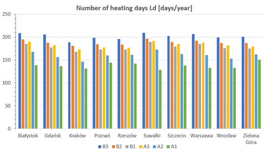 This article presents comparative analyses of the length of the heating season in 59 surveyed locations in Poland. It includes a comparison of how the energy class of the building according to [22], as well as the meteorological data of the analyzed locations, affect the length of the heating season (Ld) and the number of heating degree days (HDDs) calculated on the basis of [17,18,19,20]. In accordance with the methodology adopted, the length of the heating season for individual locations and energy classes of buildings depends on the balance of profits, heat losses, heat capacity, the building mass, and its location. The calculation of the number of heating degree days was made based on the formula: