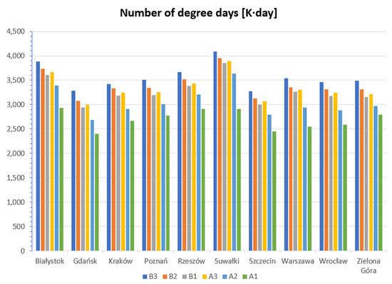 In each location, calculations were made for 6 energy classes of buildings (A1, A2, A3, B1, B2, and B3), in accordance with the assumptions presented in the work of Alsabry et al. [22].