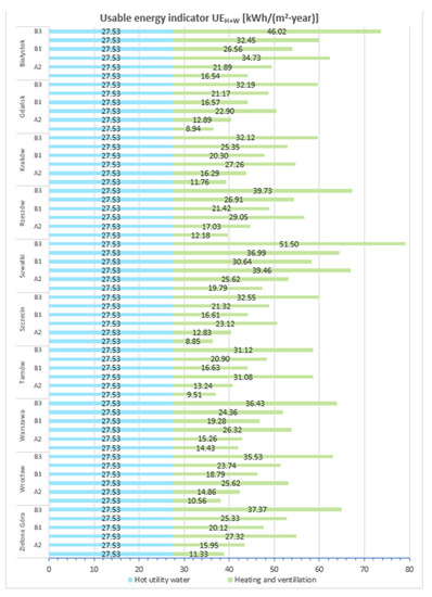 For buildings designed in energy class A3, the minimum indicator of the annual demand for usable energy for heating and ventilation was calculated for Świnoujście (north-western region of Poland) and was 20.99 , and the highest indicator of the annual demand for usable energy for heating and ventilation ( was calculated for Suwałki (north-eastern region of Poland) and was 39.46 . The average demand for usable energy for heating and ventilation for a building designed in the A3 energy class was 27.57 . A detailed summary for buildings in the A3 energy class is presented in Table S7.