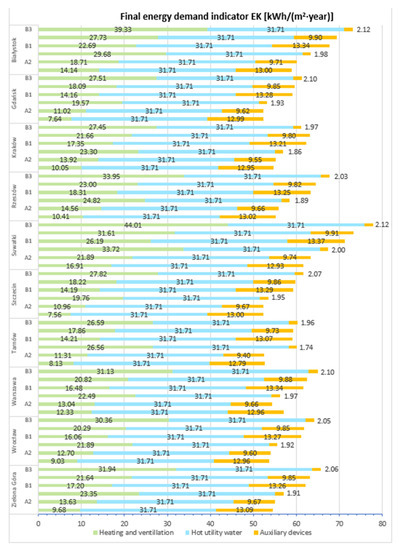 The calculations of the demand for final energy were made, which also included the demand for auxiliary energy to supply the heating system, mechanical ventilation, and the hot water system. The analyses show that higher demand for final energy occurred in buildings with a higher demand for usable energy for heating purposes. It should also be noted that a higher demand for final auxiliary energy occurred when mechanical ventilation is used. The length of the heating season had only a slight impact on the difference in auxiliary energy consumption. The details are presented in Scheme 5.