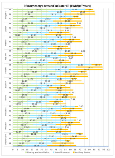 The authors of this research clearly reveal that designers must approach the design of buildings individually. Buildings designed according to the adopted standard in Suwałki and Białystok, regardless of the energy class, exceeded the maximum value of the demand for primary energy (EP) according to the technical conditions [26]. It is worth noting that for Suwałki (climate zone V), the maximum primary energy demand index (EP) occurred for class B3 and amounted to 93.41 . For the same energy class of a building located in Wrocław (climate zone II), the primary energy demand index (EP) was 66.38 . When the demand for primary energy consumed by auxiliary devices was analyzed in detail, it was noticed that for the B3 energy class of a building located in Suwałki, the annual demand for primary energy (EP) consumed by auxiliary devices was 7.99 , while in Wrocław, the primary energy (EP) used by auxiliary devices was 2.43 . A building in the A1 energy class located in Wrocław was characterized by the demand for primary energy (EP) at the level of 60.57 and met the requirements of WT [26], while the same building designed in Suwałki was characterized by the demand for primary energy (EP) at the level of 78.40 and did not meet the requirements of WT [26]. When analyzing the demand for primary energy consumed by auxiliary devices in detail, it was noticed that for the A1 energy class of the building located in Suwałki, the annual demand for primary energy (EP) consumed by auxiliary devices was 32.53 , while in Wrocław, the primary energy (EP) consumed by auxiliary equipment was 25.30 . The demand for primary energy used by auxiliary devices in buildings with mechanical supply and heat recovery exhaust ventilation (class B1 and class A1) located in Wrocław was analyzed. The annual demand for primary energy (EP) used by auxiliary devices for a building in the B1 energy class was 27.53 , while for a building in the A1 energy class, it was 25.30 . The analyses show that the energy class of buildings, the location of the building, and the climate data significantly affect the demand for primary energy of a building and its ability to meet the legal requirements.
