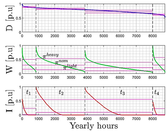 - Electric demand levels have a significant impact on the system’s operation; in this regard, planning horizons were divided into time blocks, according to curve D. Then, the information of W and I in each time block was sorted in descending order, as presented in Figure 1. Note that this strategy loses the chronology of the data; however, this was not a significant issue for medium-term operation planning.