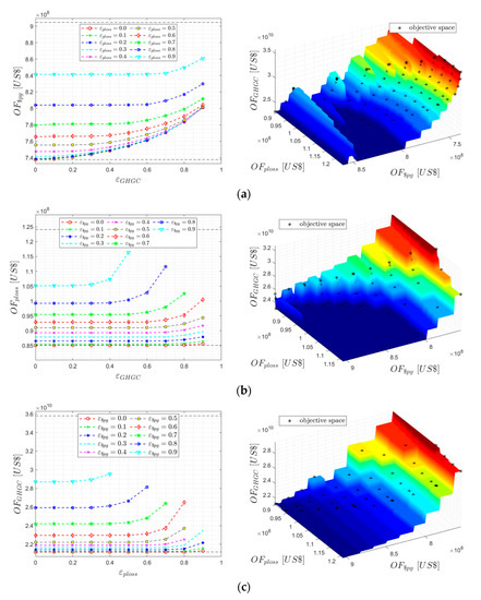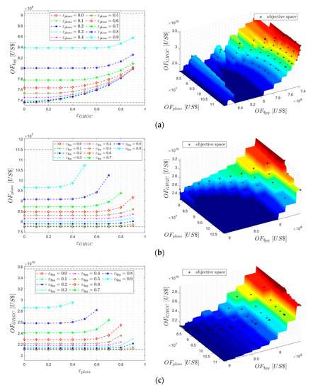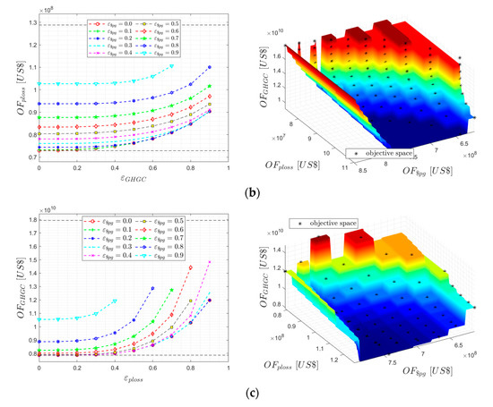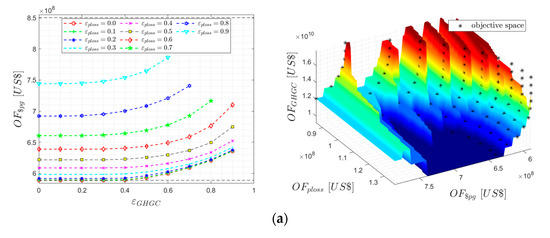 Table 3 displays the environmental conditions that were adopted in the simulations. In addition, uniform meteorological and seasonal conditions were adopted for locations with RES units; based on previous experiments, we concluded that this would demonstrate acceptable system behavior for one year. The ε-constraint method employs ε values ranging from 0 to 0.9 in increments of 0.1, to construct Pareto curves. Step 1.0 was dismissed in the ε-constraint method because it cannot find OF values lower than the minimal OF.