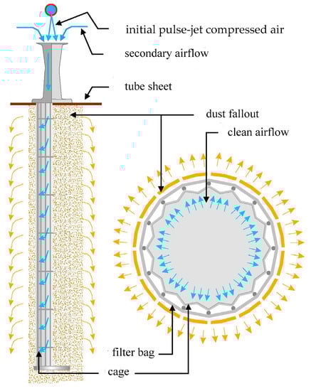 Industrial dust and industrial soot emissions are the main pollution sources affecting the quality of the atmospheric environment [1]. As effective facilities for controlling dust, especially fine particles, bag filters have the characteristics of high efficiency and good economy and are widely used for dust treatment in coal, electric power, steel, cement, and waste incineration industries [2,3]. The pulse-jet cleaning process is an important part of the bag filter workflow, and its performance is directly related to the effect of energy saving and emission reduction. By adopting advanced methods, optimized cleaning parameters can be obtained, thus improving the overall operating efficiency of bag filters.