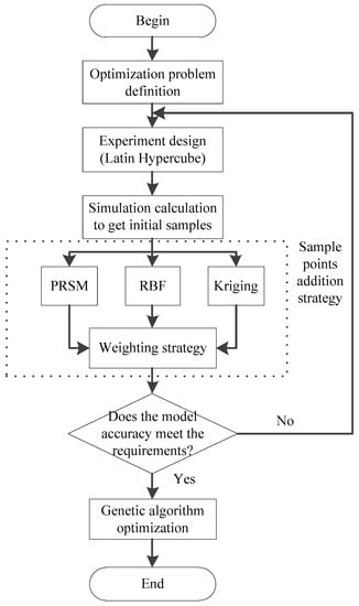 The optimization algorithm proposed in this paper is a multi-parameter optimization strategy based on a hybrid surrogate model. The initial sample set is obtained through simulation experiments, and the hybrid surrogate model will be constructed. The accuracy of the hybrid surrogate model should be inspected in combination with the actual problem, and if it meets the requirements, the global optimal solution of the model will be obtained by the genetic algorithm; otherwise, the hybrid agent model needs to be updated by selecting a suitable addition strategy until the model accuracy meets the requirements. The process of optimization based on the hybrid surrogate model is displayed in Figure 2.