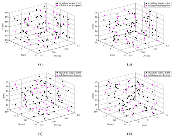 The distribution of modeling sample points and validation sample points: (a) P-L-D, (b) P-L-d, (c) P-D-d, (d) L-D-d.