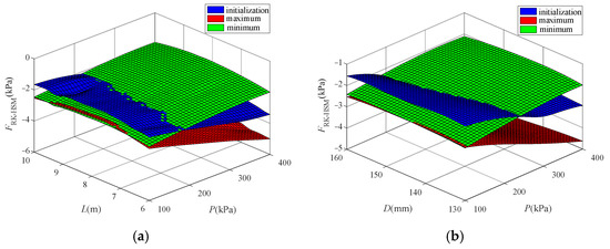 Under the initial experience setting condition ( = 250 kPa, = 8 m, = 145 mm, and = 16 mm), the simulation result of F is −2526.6148 Pa. For the seven surrogate models constructed above, including three sub-surrogate models and four hybrid surrogate models, the genetic algorithm is applied to seek the optimal combination of the four variable parameters (P, L, D, and d) involved in the pulse-jet dust-cleaning process to maximize F. The results are shown in Table 6.