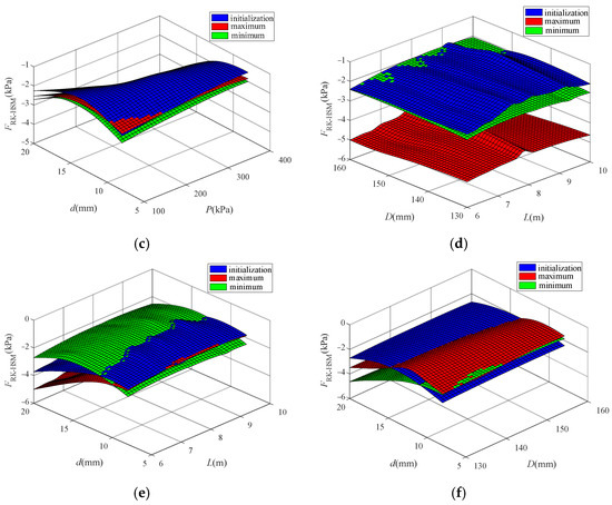 Applying the best-performing hybrid surrogate model RK-HSM in this study, the values of the average pressure on the inner side wall of the filter bag at 1 m from the bag bottom during the pulse-jet dust-cleaning process under different parameter combinations can be obtained, as shown in Figure 7, which can be used to study the influence of different parameters on the pulse-jet dust-cleaning process. The parameter conditions corresponding to the images in Figure 7 are shown in Table 4.