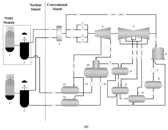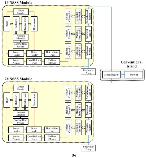 The modular system layout of the HTR-PM plant is illustrated in Figure 1a. As shown in the schematic diagram, the HTR-PM plant comprises two major parts, i.e., the nuclear island and the conventional island. As the key components of the nuclear system, the NSSS modules on the nuclear island side mainly consist of a high-temperature gas-cooled reactor, a helical-coil once-through steam generator and control devices such as a control rods system and a helium blower. The secondary fluid network on the conventional island side is composed of various circulation devices such as a turbine generator, condenser, heater, deaerator and feedwater pump.