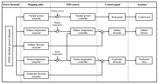 The global parameter mapping is built through the manipulated variables , which include external reactivity, helium flow rate, feedwater flow rate and opening of the main steam regulating valve for the HTR-PM plant. Load change operations of the nuclear system are carried out based on the coordinated PID control scheme shown in Figure 5. Under this control scheme, each manipulated variable is determined by the thermal power demand of the dual NSSS modules and the look-up table method [38]. Hence, we can reduce the design space from seven-dimensional to two-dimensional (i.e., 1# PowerDemand and 2# PowerDemand) for convenience of discussion. It is noteworthy that only thermal power demand from 50% RFP to 100% RFP is studied, whereas special scenarios such as shutdown and accidents are not our concern.
