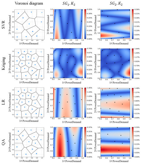 Sample ranking, condition testing, parameter estimation and surrogate construction are alternately repeated until the surrogate accuracy achieves the expectation. The experimental results of global model calibration based on different surrogates are shown in Figure 6. The Voronoi diagrams on the left column illustrate the sample distribution in the design space. With the same initial samples and measurement noise level, the sampling procedures based on SVR, QA, Kriging and LR surrogates end with 11, 14, 19 and 19 experiments, respectively. In the Voronoi diagrams, larger blue dots represent higher parameter uncertainty evaluated. It can be intuitively observed that the uncertainty of the parameter increases when the NSSS module is operating under a low load condition, and the algorithm therefore tends to drive sampling to this region. The surrogate accuracy is validated by calculating the relative prediction errors over the design space and shown in the heatmap on the right. The SVR surrogates outperform other surrogates in both the number of experiments and global prediction accuracy. The maximum relative errors of the parameters predicted by the SVR surrogates are as low as 0.35% and 0.36%. Despite the equally satisfying accuracy provided by the QA surrogate, it requires at least samples to determine the regression coefficients, which is obviously unsuitable for high-dimensional input cases. Considering the strict safety standards and high experimental cost of the HTR-PM plant, we highlight the effectiveness of SVR in small sample learning.