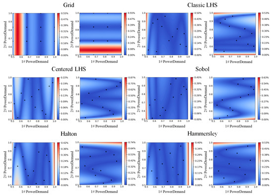 We compare the proposed adaptive model calibration scheme with conventional techniques based on static experimental designs. All the model calibration experiments employ SVR with the Gaussian kernel as the global surrogate of parameter mapping. The static experimental designs include grid sampling, Latin hypercube sampling (LHS, classic LHS and centered LHS) and low-discrepancy sequences (Sobol, Halton and Hammersley) [23]. Except for the grid design, which samples 16 experimental conditions, all the other designs select 12 experimental conditions for global model calibration. For each experimental design, the SVR surrogates are constructed based on the corresponding samples. The resulting SVR surrogates’ relative prediction errors over the design space are shown in Figure 7. The black dots in each heatmap represent the experimental conditions determined by the corresponding experimental design. Our adaptive model calibration scheme mainly outperforms the static techniques in two aspects. On the one hand, the static techniques focus on evenly filling the design space and cannot utilize the system response, whereas the adaptive scheme can identify the irregular regions of parameter behavior by information of parameter nonlinearity and uncertainty. On the other hand, static experimental design is essentially a one-shot approach, which may lead to oversampling or undersampling in practice. On the contrary, the adaptive scheme based on a sequential design can make flexible adjustments to the system response and end the sampling procedure in time once the parameter mappings are precise enough. Consequently, the adaptive model calibration scheme achieves higher parameter prediction accuracy over the global operating domain (the maximum relative errors of the globally calibrated parameters and are as low as 0.35% and 0.36%, respectively) through fewer trials (only 11 condition experiments are conducted), which is meaningful for the safety and economy of the HTR-PM plant.