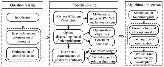 The microgrid system is described in Section 2. The microgrid cluster optimal dispatch model is developed in Section 3 in terms of both the optimization objectives and constraints, respectively. In Section 4, a distributed economic model predictive controller is designed, and a Nash-optimal-based method is proposed to solve the optimization. In Section 5, a microgrid group composed of four microgrids is used as a practical example for simulation verification, and the corresponding simulation results are presented. Finally, conclusions are made in Section 6.