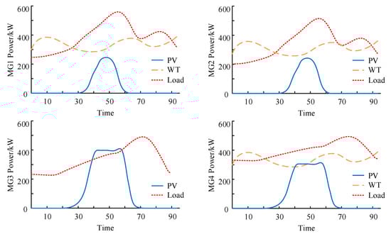 Curves of PV output power, WT output power and load for MG1 to MG4.