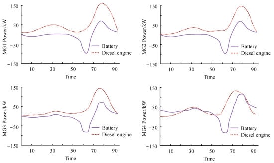 The 96-step rolling optimization results of the microgrid group within 24 h are shown in Figure 6 and Figure 7, where Figure 6 shows the controllable power output of the four sub microgrids and Figure 7 shows the exchange power of the four sub microgrids. From the 57th to the 68th moment, there was ample sunlight during this period, and the output of the photovoltaic and wind turbines exceeded the demand of the load. The battery was in a charged state. From the 70th to 96th moment, the load demand was high, and the power was supplied by both the battery and the diesel engine rather than the battery first and then the diesel engine. Simultaneously supplying power can prevent diesel engines from operating under high loads and reduce operating costs. MG3 was not connected to the wind turbine, and the output of photovoltaic power was insufficient to meet the load demand for most of the time. Therefore, MG3 obtained exchange power from the other sub microgrids, which reflected the energy complementarity advantage of the microgrid group.