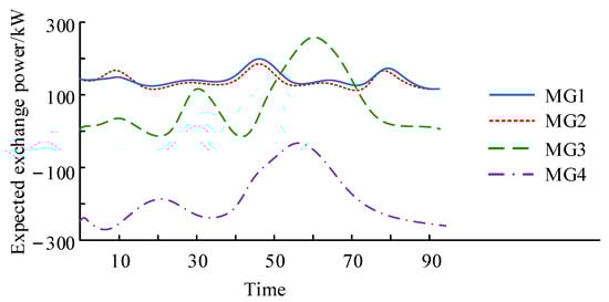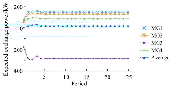 To illustrate the convergence of the distributed algorithm at a certain optimization time, Figure 9 shows the expected exchange power of each sub microgrid during the iteration process at the first optimization time. After the first iteration, the exchange power of each sub microgrid only met its internal optimal. The optimization result was not a global optimal and did not meet the power balance constraint of the microgrid group. Therefore, the average expected exchange power was not 0. As the number of iterations increased, MG4 obtained more exchange power from the other sub microgrids to achieve its optimal power allocation, and the average expected exchange power also approached 0 to meet the power balance of the microgrid group. After iterative convergence, the expected exchange power of each sub microgrid met the global optimization of the microgrid group.