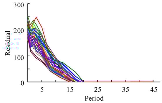 Figure 8 shows the convergence of the residuals in the optimization over 40 time periods. From Figure 8, it can be seen that the optimization process at all times convergeed after fewer than 40 iterations. The curves of each color in the figure represent an iteration.