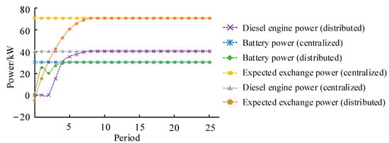 In order to demonstrate the consistency of the results between distributed optimization algorithms and centralized optimization methods, distributed and centralized algorithms were used to solve the optimization problems of microgrid clusters for comparison. Taking the 25th optimization moment as an example, Figure 10 shows the iterative process of the energy storage output, diesel engine output and expected exchange power of MG4. In addition, it was compared with the corresponding calculation results of the centralized optimization. From Figure 10, it can be seen that the energy storage and diesel engine output ultimately converged with the calculation results of the centralized algorithm after multiple iterations of the distributed optimization algorithm. Therefore, this indicated that the iterative results of the DEMPC algorithm proposed in this paper were the optimal solution.