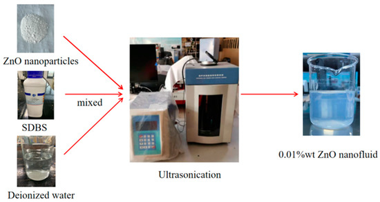 The ZnO nanofluid with a mass fraction of 0.01% was prepared by the two-step method. The material reagent parameters used for the preparation are shown in Table 1. Figure 1 shows the preparation process of ZnO nanofluids.