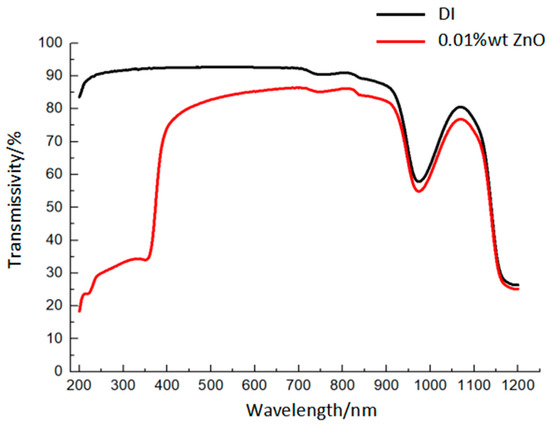 Curves of 0.01 wt% ZnO nanofluid transmittance as a function of wavelength.