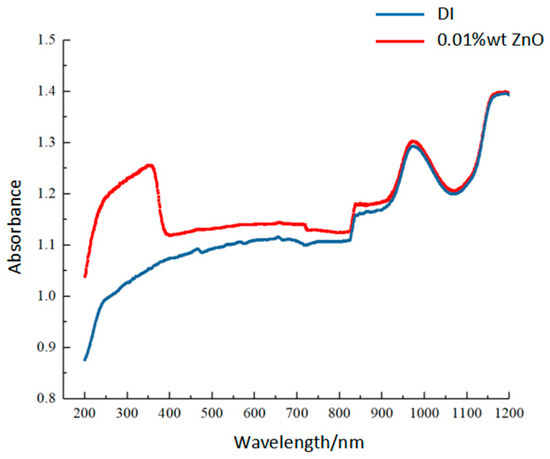 Compared with DI (deionized water), the absorbance of the resulting ZnO nanofluid in the visible light range of 400–800 nm showed the same trend with wavelength, and the degree of attenuation was within 0.1, as illustrated in Figure 3. This means that the absorption of solar radiation in the visible wavelength range of ZnO nanoparticles is not much different from that of DI, which can ensure that the irradiation in the effective wavelength range beneficial to the power generation of PV panels can be irradiated to the surface of PV panels through the fluid. The visible ZnO nanofluid has an obvious absorption peak of around 380 nm. Still, it maintains an absorption value of about 1.25 between 230 and 380 nm, indicating a strong absorption effect on UV light in this wavelength band.