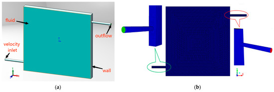 To simulate the flow state and heat transfer of a nanofluid in the interlayer of the splitting module more accurately and conveniently, this experiment simplifies the actual module into a three-dimensional rectangular interlayer with an inlet and outlet. The geometric dimensions are kept the same as the actual ones. The computational domai diagram is shown in Figure 5a. The six boundary surfaces are set adiabatically, excluding other variables, and the influence of the inlet end on the flow state and heat transfer uniformity of the fluid inside the interlayer is studied purely. Assume that the angle between the light-receiving surface and gravity direction is 130°, and the nanofluid inside the interlayer is simplified to a liquid with the same thermal conductivity and viscosity as the actual fluid. The inlet flow rate is set to 0.533 m/s, the inlet temperature is 313 K, and the initial temperature is 298 K, which is imported into ANSYS for transient simulation. The walls are set to be insulated and have no-slip boundary conditions. The simulation variables are the length of the inlet pipe inserted into the cavity, the position, and the distribution of the water divider.