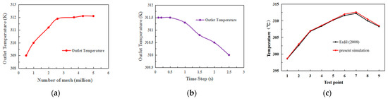 The grid independence study of the module is conducted by generating different grid numbers of 500, 1000, 2000, 2600, 3700, 4300, and 5000 thousand. Grids are three-dimensional and unstructured. A detailed grid diagram is shown in Figure 5b. The outlet temperature for different mesh numbers is presented in Figure 6a. The reason for choosing 2.6 million is that the PV/T outflow temperature is almost the same when the number of grids is greater than 2.6 million. The minimum grid size of 0.5 mm. The suitable time step is also determined according to the outlet temperature difference of the system for seven-time steps of 0.1 s, 0.2 s, 0.5 s, 1 s, 1.5 s, 2 s and 2.5 s. Figure 6b illustrates the outlet temperature difference in the simulations with various time step sizes. Therefore, the step size of 0.5 s is chosen.