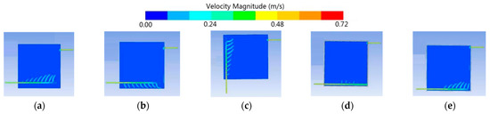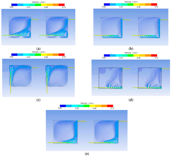 Compared with case V, the velocity vector in case VI (Figure 9e) almost does not change with time. The same gyration is formed in the center space of the interlayer, and the velocity distribution is denser along the right side of the wall. The direction of the water outlet from the diversion hole is biased towards the direction of the outlet end. The reason is more similar to case II and will not be repeated.