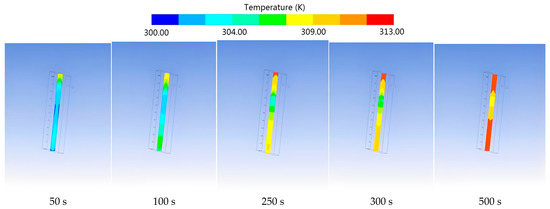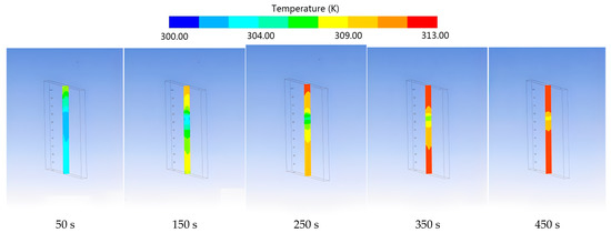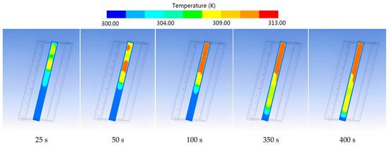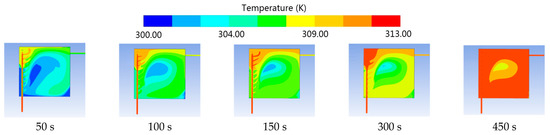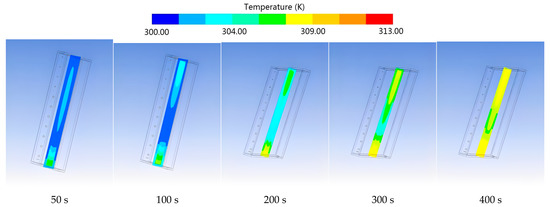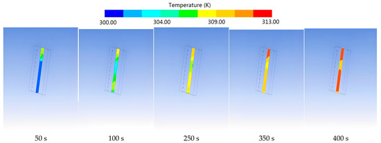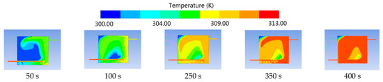 The temperature distribution of the cross-section at different time nodes under case I is shown in Figure 10. The lower side and right-side walls reach the highest temperature in the interlayer first. Because of the rotation in the center of the interlayer, the fluid flow in the center is slow, compared to the surrounding convective heat transfer is very weak, so there is a “leafy” low-temperature zone, and the temperature distribution is not uniform. The upper left corner is also a small area of low-temperature zone formed due to the slow flow and weak heat transfer. After 400 s, the maximum temperature difference reaches about 9 °C.