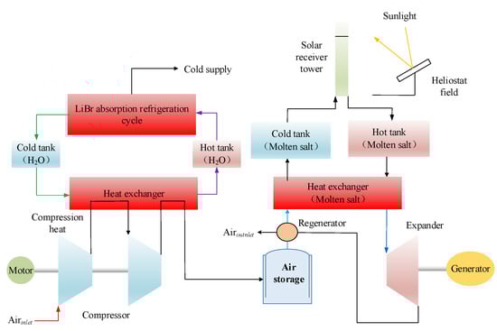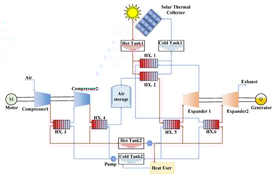 - Li, P.; Hu, Q.; Sun, Y.; Han, Z. Thermodynamic and economic performance analysis of heat and power cogeneration system based on advanced adiabatic compressed air energy storage coupled with solar auxiliary heat. J. Energy Storage 2021, 42, 103089. [Google Scholar] [CrossRef]