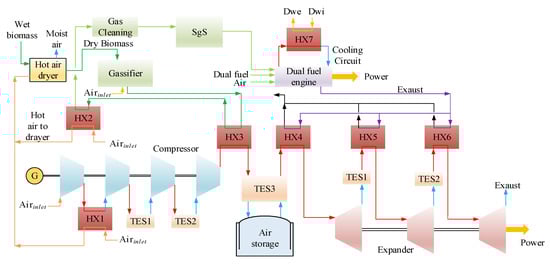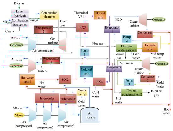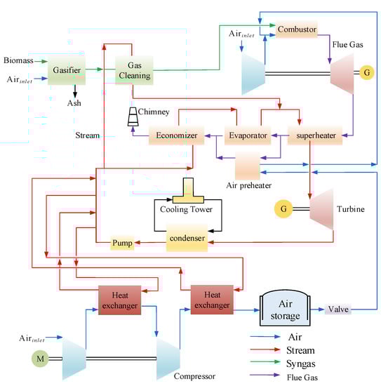 - Xue, X.; Li, J.; Liu, J.; Wu, Y.; Chen, H.; Xu, G.; Liu, T. Performance evaluation of a conceptual compressed air energy storage system coupled with a biomass integrated gasification combined cycle. Energy 2022, 247, 123442. [Google Scholar] [CrossRef]