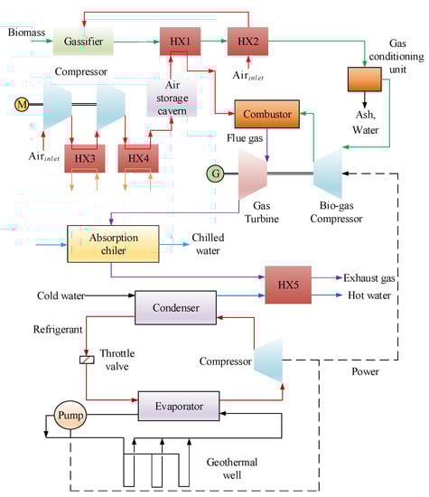 - Zhang, X.; Zeng, R.; Deng, Q.; Gu, X.; Liu, H.; He, Y.; Mu, K.; Liu, X.; Tian, H.; Li, H. Energy, exergy and economic analysis of biomass and geothermal energy based CCHP system integrated with compressed air energy storage (CAES). Energy Convers. Manag. 2019, 199, 111953. [Google Scholar] [CrossRef]