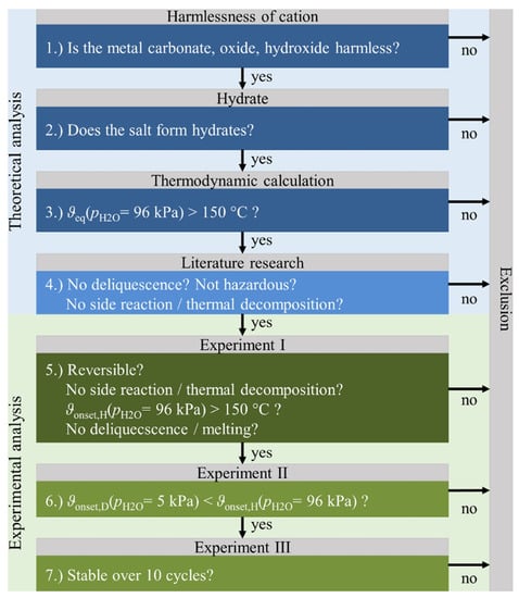 - N’Tsoukpoe, K.E.; Schmidt, T.; Rammelberg, H.U.; Watts, B.A.; Ruck, W.K.L. A Systematic Multi-Step Screening of Numerous Salt Hydrates for Low Temperature Thermochemical Energy Storage. Appl. Energy 2014, 124, 1–16. [Google Scholar] [CrossRef]