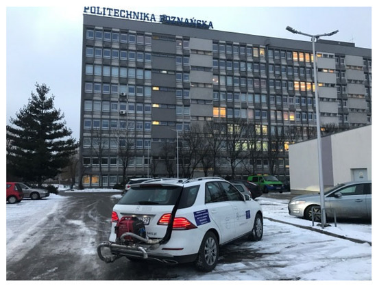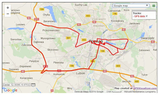 The exhaust emission measurements were carried out on the Poznań_RDE route designed by the authors. It starts at the location of Poznan University of Technology and runs through the nearby city districts (southeastern parts) and downtown Poznan (urban portion). Upon covering the urban part, the route leads to the eastern parts of the city and then through the main thoroughfares towards national road no. 92 (Figure 1). During the investigations on the said route, a smooth passage from the urban to the rural portion took place that ended on the S11 highway (the western part of the city beltway), where the last part of the test began (highway portion). The test route was performed mainly on the eastern part of the beltway (A2 motorway). The described portion ended at the Poznan Krzesiny motorway exit. Upon completion, the driver returned to the start point of the test procedure. The total distance of the test route was approx. 75–80 km. The divergence related to the covered distance results from the fact that it is fundamental to abide by the driving time rule, which is a minimum of 90 and a maximum of 120 min. Depending on the road congestion, it is possible to finish the measurement early prior to returning to the start point so as not to exceed the maximum RDE test time.